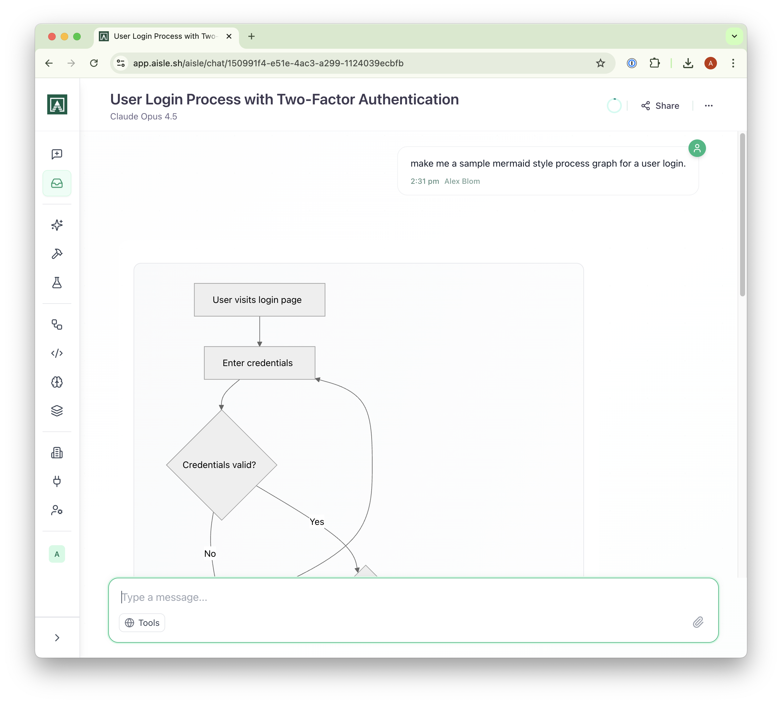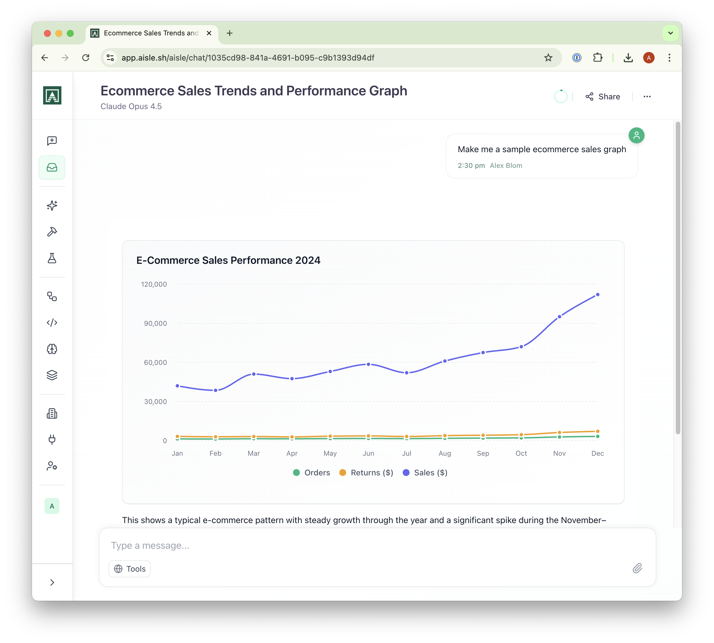 All vanilla chats now support rendered visualizations. Ask for charts, flowcharts, or mathematical diagrams and see them rendered inline - no need to copy code into external tools. Try prompts like "make me a sample ecommerce sales graph" or "create a mermaid flowchart for user authentication" and watch the visualization appear directly in your conversation.