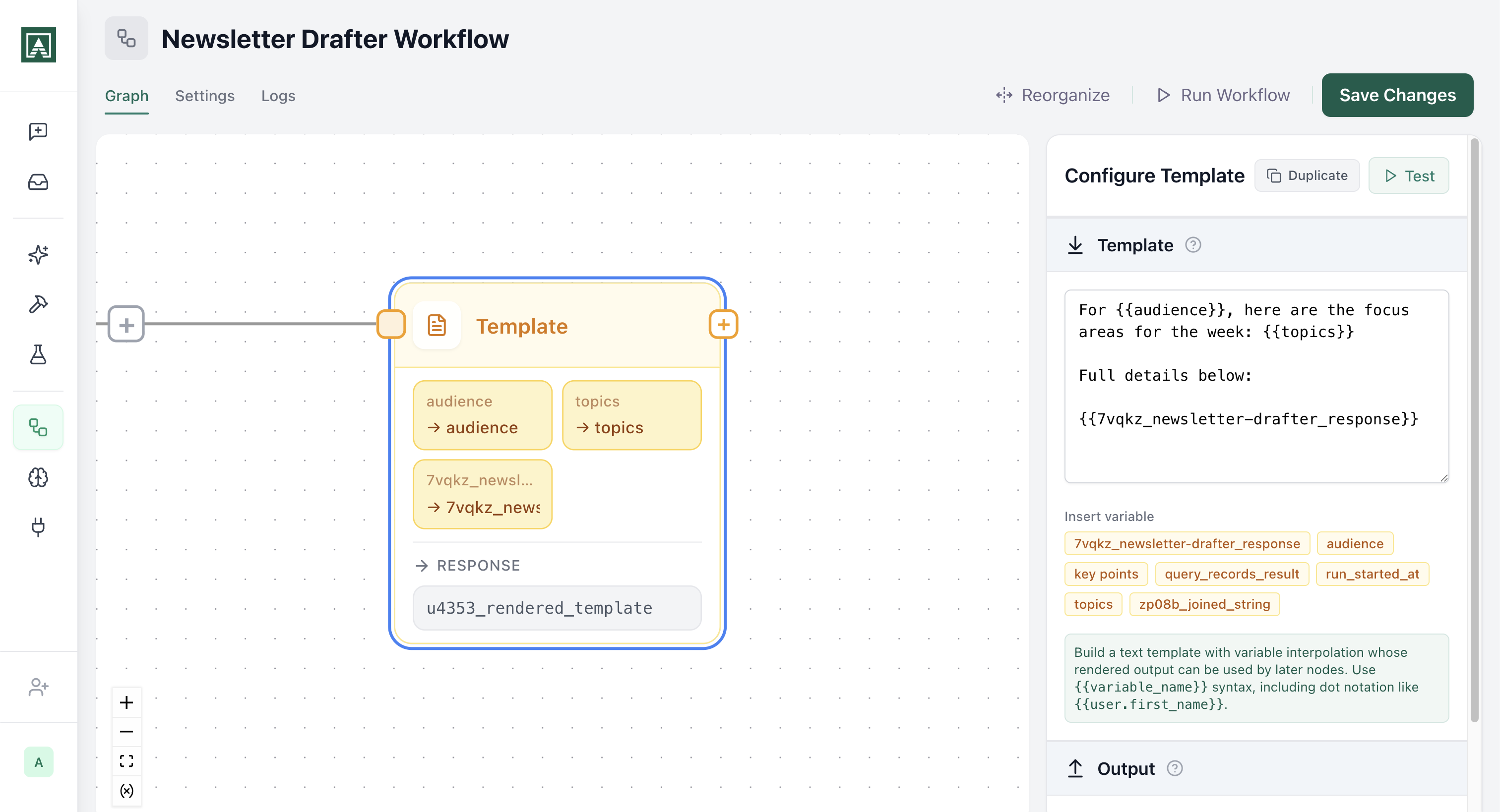 We're way too excited about this one. Write a Handlebars-style template with {{variables}}, wire in your values, and it renders the output without touching a model. No tokens, no workarounds, no cursing at a prompt node you're using as a string formatter. Clean in, clean out.